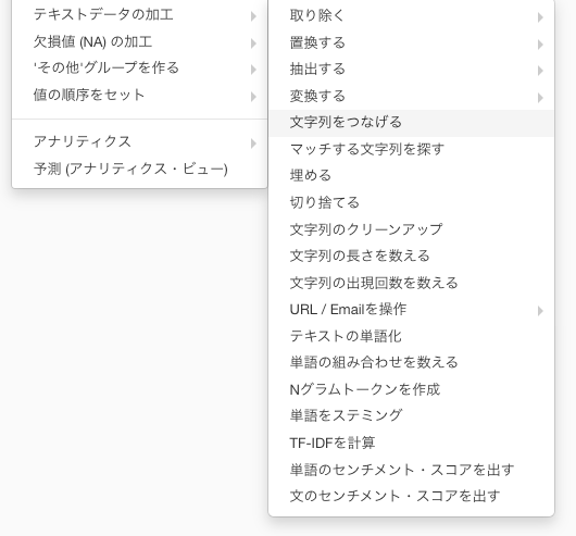 対象列を選び、メニューから「テキストデータの加工>文字列をつなげる」をクリック。