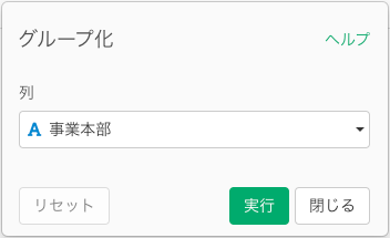画面右部、データフレームの上部にある「+」から「グループ化」を選択し、基準となる列(今回の場合は「事業部」)を指定します。