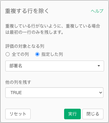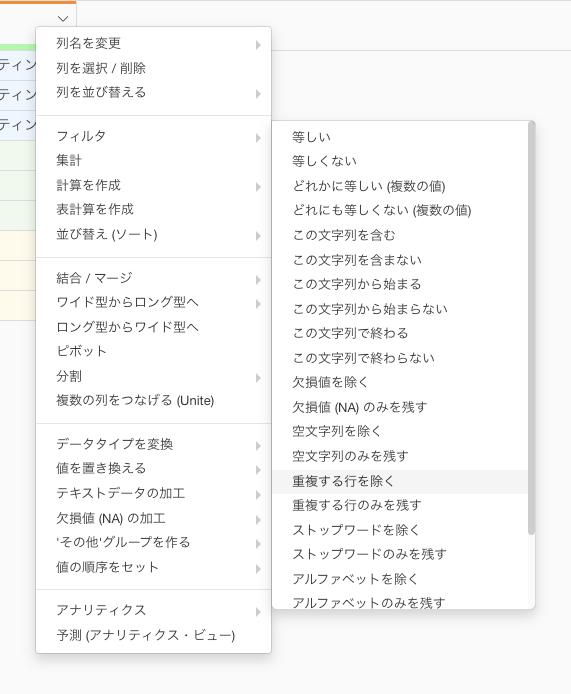 どちらかの列の右端の「v」を押してメニューを呼び出し、「フィルタ>重複する行を除く」をクリックします。