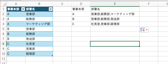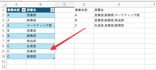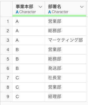 - これを事業本部と部署名を1対nで紐付けた表にしたい