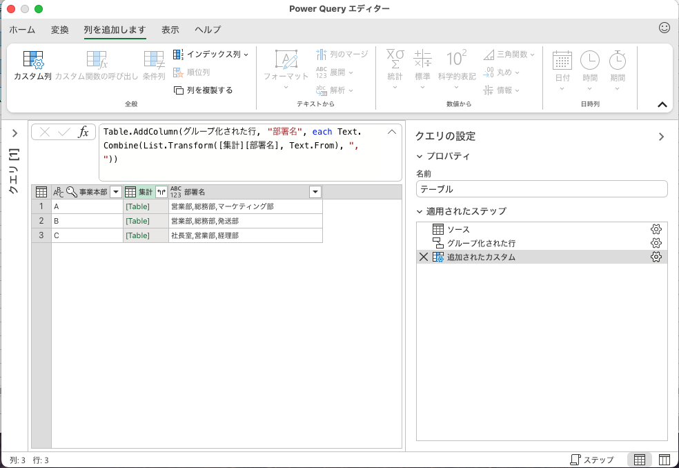 Power Queryを使う場合は、グループ化した上で「カスタム列を追加」で、M言語で変換する。