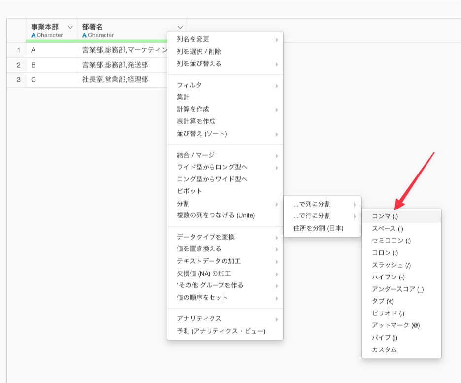 一つのセルに、同じ「事業本部」に属する「部署名」の値が入っており、これを行方向にコンマでばらしたいとき、分割>…で行に分割>コンマ(,)により、簡単に実行できる。